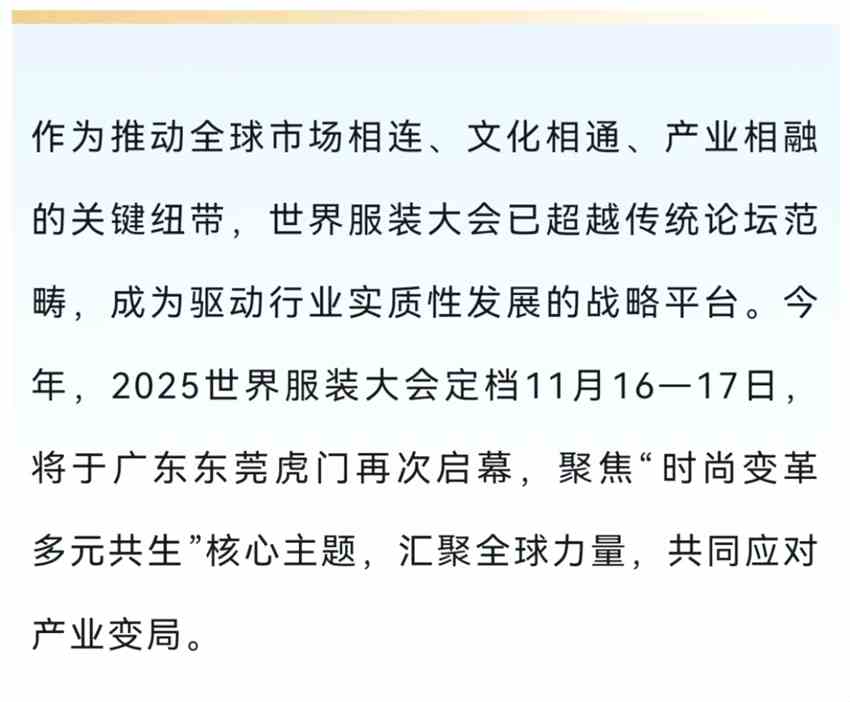 世界服装大会更是产业价值提升的关键推手。正如第20届、24届中国时装设计“金顶奖”获得者、LIUYONG品牌创始人刘勇所强调的,世界服装大会平台助力设计师明确了其在产业中的多重角色——既是消费者需求的洞察者,也是科技的应用者,更是品牌文化的诠释者。 立足大会平台,中国服装产业的顶尖设计师与前沿企业家曾向全球同行展示中国文化的深邃广博与时尚创意的勃勃生机。素白品牌创始人马乖认为,当前正值本土品牌建设的黄金时期,中国互联网的发展为设计师提供了前所未有的广阔舞台。中国设计师们也日益明确自身品牌的定位与追求,生活在左创始人林栖则致力于中国传统服饰文化的传承与创新,将传统技艺与现代审美巧妙融合。 真维斯国际(香港)有限公司董事兼副总经理刘伟文也曾借助企业的实践经历阐明,正是在世界服装大会倡导的“时尚变革、多元共生”等理念推动下,非遗文化与现代时尚得以深度融合,进一步助力“国潮”从概念走向市场,实现商业价值与文化传承的双赢。 结语: 促成商机对接、明确产业方向、升华文化价值,世界服装大会正持续不断地为行业源头活水。在“时尚变革 多元共生”的主题指引下,2025世界服装大会必将进一步夯实其作为行业凝聚共识、协同创新、迈向未来的核心地位与关键作用。 (来源:纺织服装周刊 记者-李亚静)