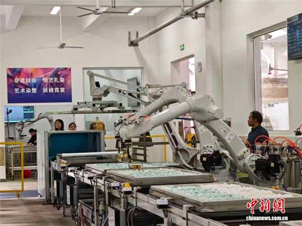 “我们坚持‘智能注染+手工扎花’的模式,既通过机器人保证了颜色统一度和生产效率,又保留了手工工艺的个性化温度。”钱丽霞表示,这一创新让扎染作品更广泛地走进大众生活。