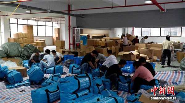 进入打包作业区,地上摆放了数十个纸箱,大伙分工协作,一部分工人负责将箱内的物品按数量和类别挑出,其余人负责将物品装进包裹。