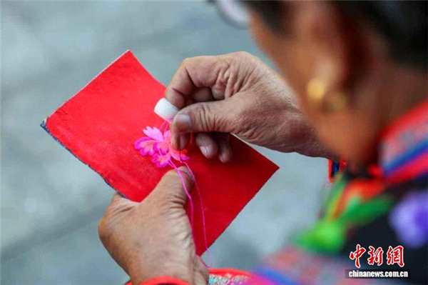 9月26日,内蒙古科右中旗,年过花甲的绣娘曹海杰依旧喜欢用传统刺绣方法。 中新社记者 张玮 摄