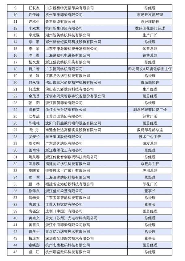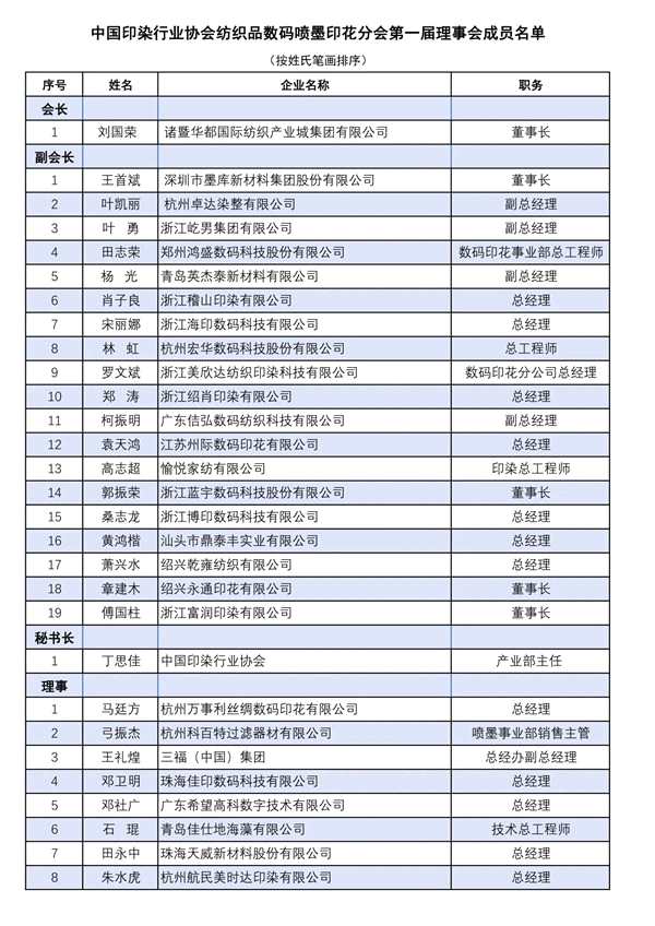 中国印染行业协会纺织品数码喷墨印花分会第一届理事会成员名单
