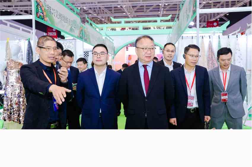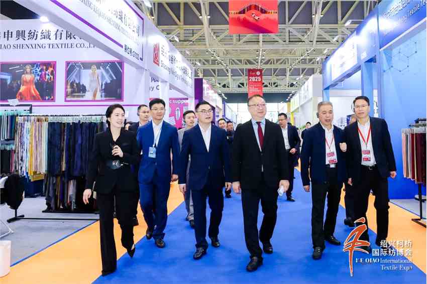 展会期间,中国纺织工业联合会党委书记、会长孙瑞哲,中国商业联合会副会长马巍,中国纺织工业联合会秘书长夏令敏,中国纺织工业联合会副会长李陵申、阎岩等行业领导,以及柯桥区领导袁建、吴海洋、丁贵、李彰等参观展会现场。在参观过程中,孙瑞哲一行与参展商和采购商深入交流,详细询问产品研发、科技创新、市场拓展及智能化生产设备应用等情况,认真了解企业在国际市场开拓、绿色转型实践与时尚创意设计等方面取得的创新成果,鼓励企业坚定发展信心、抢抓“双循环”机遇,持续深化产业链协同创新,打造竞争优势,探寻发展增量,不断提升柯桥纺织的国际影响力和时尚话语权。