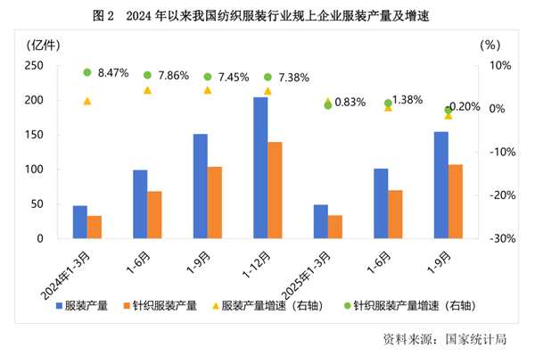 2025年1—9月,我国纺织服装行业规模以上企业服装产量同比下降1.47%;其中针织服装产量同比下降0.20%,累计增速自8月份以来首次出现负增长,生产节奏有所放缓。针织服装的产量占服装总产量的比重为69.39%,处于历史高位。针织服装凭借产品创新与场景适配能力,在服装总产量中保持高位占比,展现出较强的市场韧性。