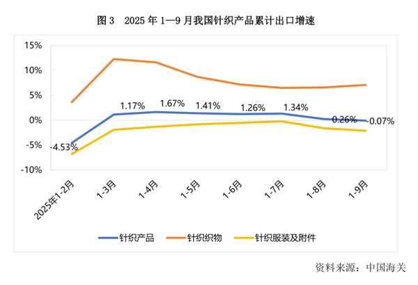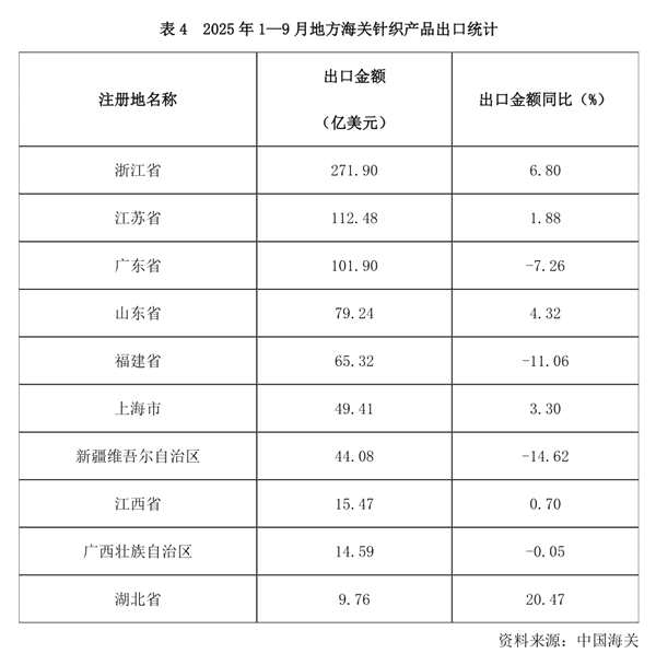 两大核心出口品类表现分化明显,呈现“织物强、服装弱”的格局。针织织物出口延续增长态势,1—9月出口189.92亿美元,同比增长7.1%,保持稳健增长势头,成为支撑行业出口的重要力量。针织服装及附件出口则面临较大压力,1—9月出口619.83亿美元,同比下降2.1%,且降幅较1—6月扩大1.6个百分点,终端消费需求疲软与贸易环境波动的影响持续显现。