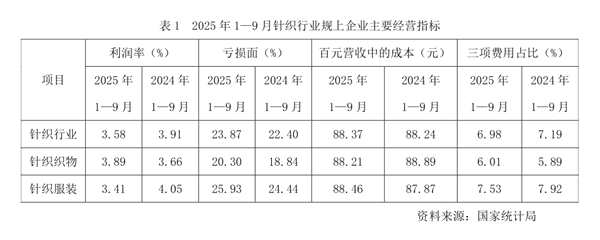 2025年1—9月,针织规模以上企业利润总额同比下降13.2%,降幅较1—6月扩大了2.2个百分点,盈利收缩态势有所加剧。营业收入利润率为3.58%,同比下降0.33个百分点;利润率较纺织行业平均水平高出0.5个百分点,行业盈利能力仍具备相对优势。成本与费用控制保持稳定,每百元营业收入的营业成本为88.37元,三项费用占比为6.98%。行业亏损面较上半年有所收窄,显示部分企业经营状况逐步改善,但亏损企业亏损额同比仍呈上升态势,缺乏核心竞争优势的企业压力进一步加大,行业内企业分化趋势愈发明显。