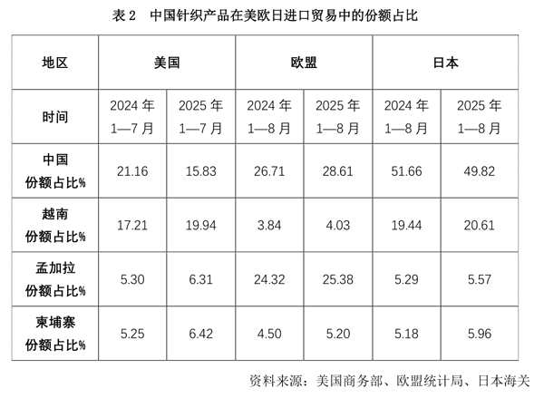 从主要出口市场来看,1—9月我国针织产品对美国出口147.25亿美元,同比下降7.23%。受美国关税政策扰动,订单转移趋势加剧等影响,短期下行压力显着,其中9月当月对美出口同比降幅扩大至16.39%。另据美国商务部数据显示,今年1—7月我国针织产品在美国进口贸易额中的占比为15.83%,较上年同期下降了5.33个百分点;同期,越南、孟加拉国和柬埔寨的份额占比分别提高了2.73、1.01和1.17个百分点,反映出美国市场订单的变化走向。