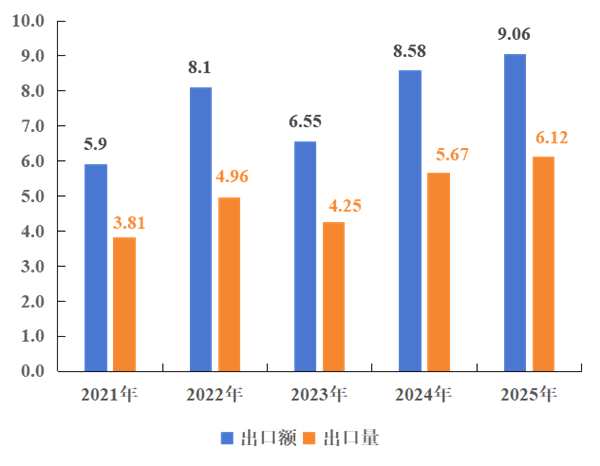 图2 我国锦纶长丝织物2021年~2025年1~9月同期出口量额(亿米/亿美元)
