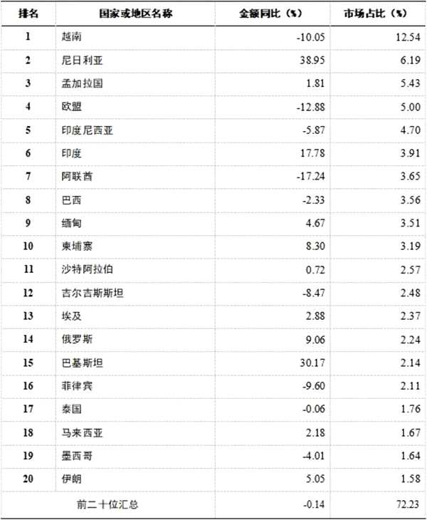 表1 2025年1~9月我国化纤长丝织物主要出口市场情况(按出口额排名)