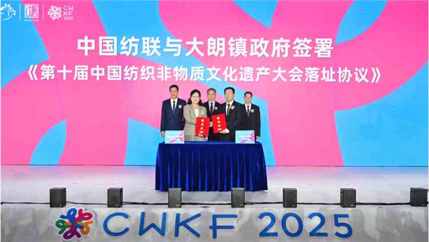 在“织交会”开幕式上,中国纺织工业联合会与大朗镇政府共同签订了《第十届中国纺织非物质文化遗产大会落址协议》,正式确定双方将于2026年6月联合举办第十届中国纺织非物质文化遗产大会,会址落地大朗。