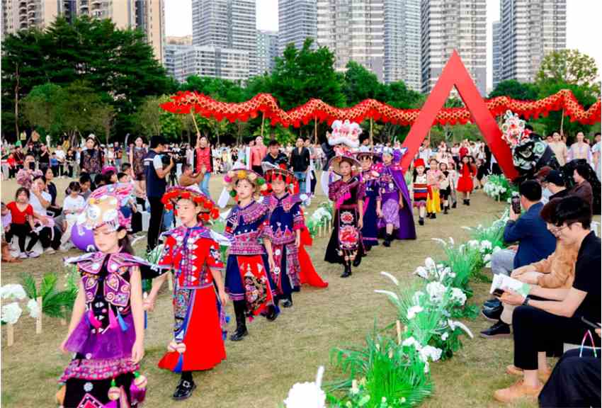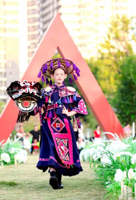 开幕式当天的“织造·潮非遗”少儿非遗大秀,大朗毛织与毛南族非遗服饰携手,将毛南花竹帽非遗编织、岭南民间工艺等精妙技艺一一展现,让千年非遗瑰宝重焕生机,尽显大朗传统与潮流交融的独特魅力。