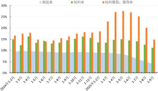 今年以来,随着国家“两重”“两新”政策加力扩围,服装企业加快推动高端化、智能化、绿色化转型升级,扩大技术改造、品牌建设、渠道布局等领域投资,行业固定资产投资增速虽小幅放缓,但仍延续了2024年以来的较快增长态势。根据国家统计局数据,1-9月,服装行业实际完成投资同比增长14.8%,增速比2024年同期放缓1.5个百分点,分别高于制造业和纺织业10.8和3.6个百分点。