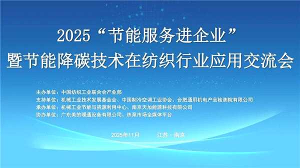 本次会议由中国纺织工业联合会产业部主办,机械工业节能与资源利用中心、南京天加能源科技有限公司承办,广东美的暖通设备有限公司、热泵市场全媒体平台协办,并得到了机械工业技术发展基金会、中国制冷空调工业协会、合肥通用机电产品检测院有限公司大力支持。