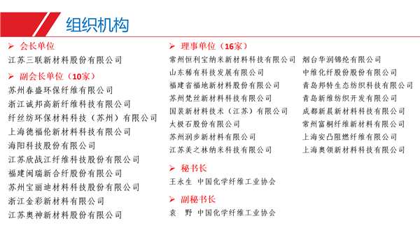 会上,中国化纤协会高性能和高功能纤维分会形成了新一届组织机构。其中,江苏三联新材料股份有限公司担任分会会长单位,苏州春盛环保纤维有限公司等10家企业担任副会长单位,中国化纤协会市场推广部主任王永生担任秘书长,中国化纤协会袁野担任副秘书长。