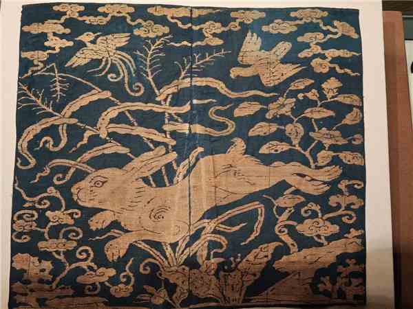 兔纹织金锦“融”是展览主线之一。一件兔纹织金锦上,卷草地上交错排列滴珠窠纹样,中间装饰兔纹,体现了游牧文化与佛教、道教的交融。