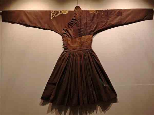 一件辫线袄是元代民族文化交融的生动见证。袄身面料采用缠枝花卉纹绫,右肩部分用蹙金绣工艺绣出扁平状云纹及团窠图案,团窠内为一只玉兔,象征月亮。左肩面料尚存、绣片缺失,据元代文献中关于肩挑日月的记载,推测图案与右肩相似,应为代表太阳的三足乌。其腰部采用绢帛拈成的辫线密密钉绣成细裥,即《元史·舆服志》中所载“制如窄袖衫,腰作辫线细折”。这种服装是流行于元代的一种男子袍服,右衽交领、紧袖,下摆较为宽大,腰间紧束,便于骑射。一直沿袭到明代,作为外出骑乘之服。